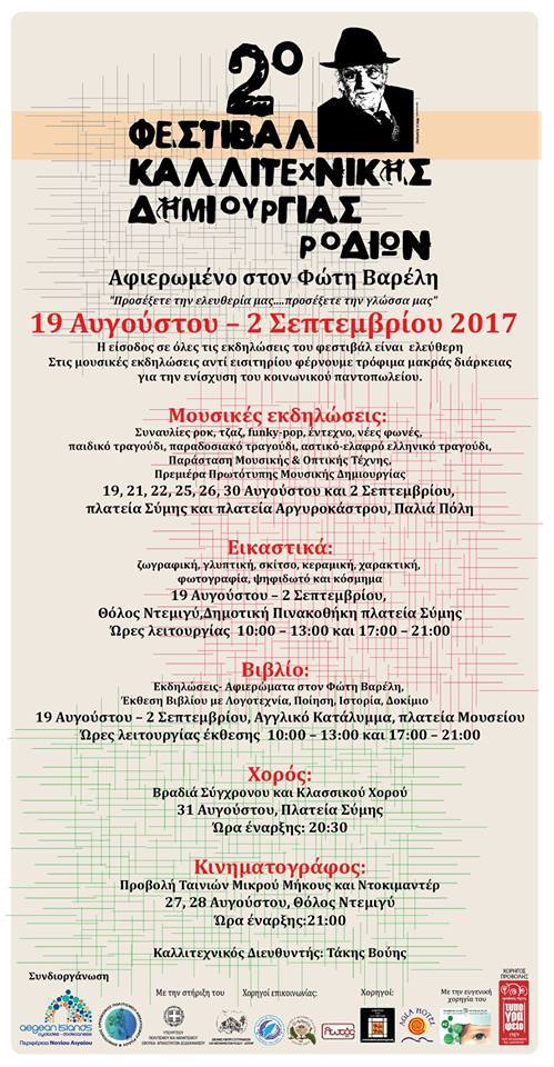 Η έκθεση Εικαστικών Τεχνών στο πλαίσιο του 2ου Φεστιβάλ Καλλιτεχνικής Δημιουργίας Ροδίων συνεχίζεται για δεύτερη εβδομάδα! Στην μεγαλοπρεπή αίθουσα του Θόλου Ντεμιγύ συνεχίζεται μέχρι το Σάββατο 2 Σεπτεμβρίου 2017 η έκθεση εικαστικών τεχνών με την παρουσία 58 καταξιωμένων- βραβευμένων αλλά και νέων καλλιτεχνών συνθέτοντας ένα εντυπωσιακό σύνολο εκφραστικών μέσων και τεχνικών. Ζωγραφική, Γλυπτική, Κατασκευές, Φωτογραφία, Σκίτσο, Ψηφιδωτό, Υφαντική Τέχνη, Κόσμημα. Την έκθεση επισκέπτονται και την απολαμβάνουν καθημερινά πλήθος ντόπιων και ξένων επισκεπτών. Οι καλλιτέχνες - δημιουργοί είναι: