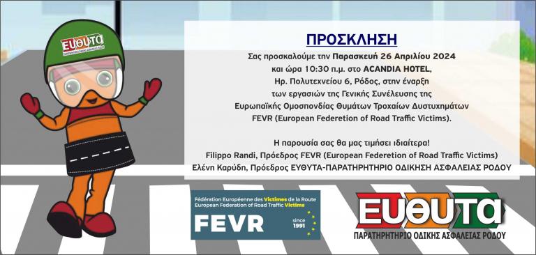 Κλείνοντας 20 χρόνια   2004-2024  δράσεων, η Ε.Υ.ΘΥ.Τ.Α-ΠΑΡΑΤΗΡΗΤΗΡΙΟ ΟΔΙΚΗΣ ΑΣΦΑΛΕΙΑΣ ΡΟΔΟΥ(EFTHITA-OBSERVATORY ROAD SAFETY RHORES), μέλος της F.E.V.R.(Ευρωπαϊκή Ομοσπονδία Θυμάτων Τροχαίων)  ανέλαβε την διεξαγωγή της  Γενικής  Συνέλευσης της F.E.V.R.(Ευρωπαϊκή Ομοσπονδία Θυμάτων Τροχαίων) στη Ρόδο με την συμμετοχή εκπροσώπων  της  από Αγγλία, Γαλλία, Γερμανία, Ιταλία, Ελλάδα, Ιρλανδία Ισπανία, Πορτογαλία, Κροατία και Πολωνία στις 26-28 Απριλίου 2024.