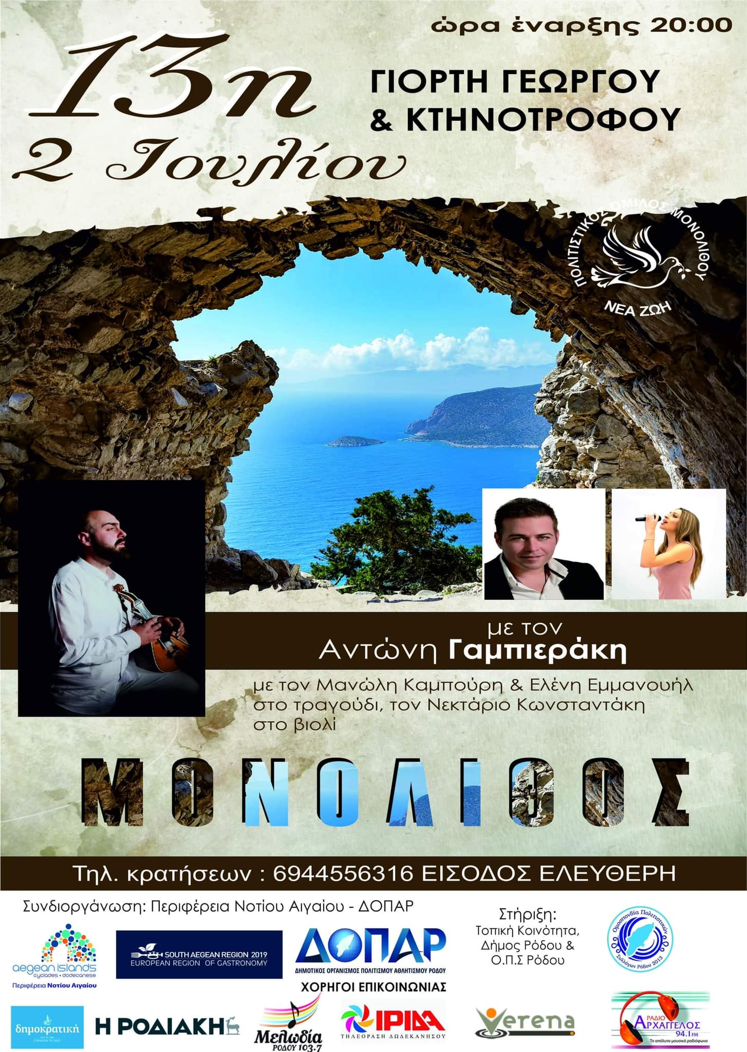 Στήριξη: Δήμος Ρόδου, Τοπική Κοινότητα Μονολίθου και Ομοσπονδία Πολιτιστικών Συλλόγων Ρόδου.