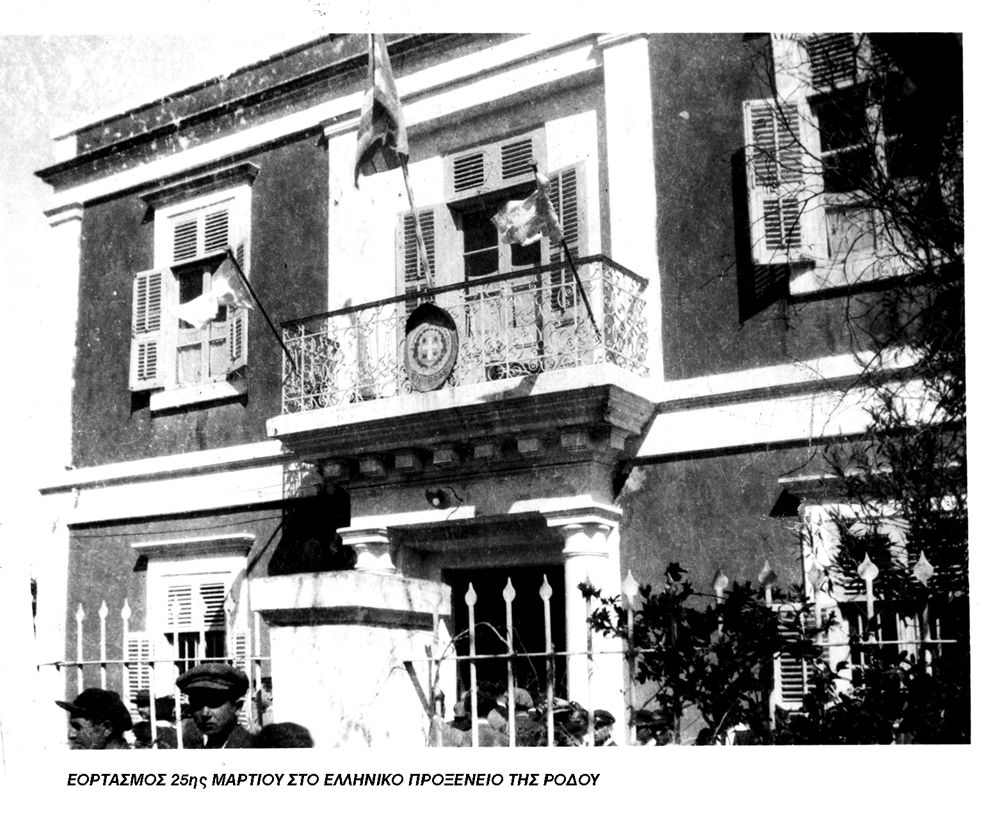 Στην φωτογραφία το επι Ιταλοκρατίας Προξενείο της Ελλάδας. Πλήθος κόσμου γιορτάζουν την επέτειο της 25 Μαρτίου. Στο κτήριο αυτό γεννήθηκα και μεγάλωσα. Χτίστηκε το 1893 απο τον προπάππο μου Σάββα Π. Παυλίδη, τον πρώτο Έλληνα δήμαρχο της Ρόδου που καθαιρέθηκε και εξορίστηκε πο τους Ιταλούς κατακτητές. Στην συνέχεια ενοικιάστηκε και στέγασε το Ελληνικό Προξενείο μέχρι το 1940. pavlidiscartoons.com/blog