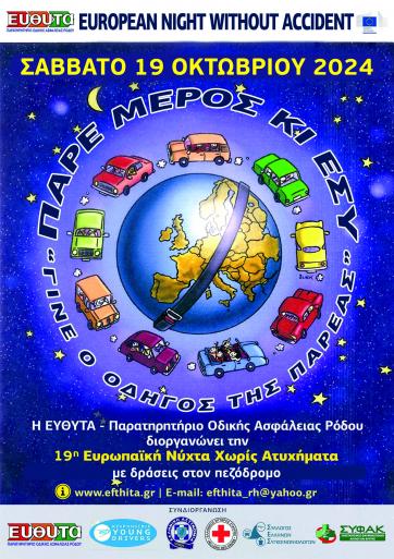 Η ΕΥΘΥΤΑ-Παρατηρητήριο οδικής Ασφάλειας Ρόδου, διοργανώνει για 19η συνεχόμενη χρονιά, το Σάββατο 19 Οκτωβρίου 2024 την επιτυχημένη δράση «ΕΥΡΩΠΑΙΚΗ ΝΥΧΤΑ ΧΩΡΙΣ ΑΤΥΧΗΜΑΤΑ»