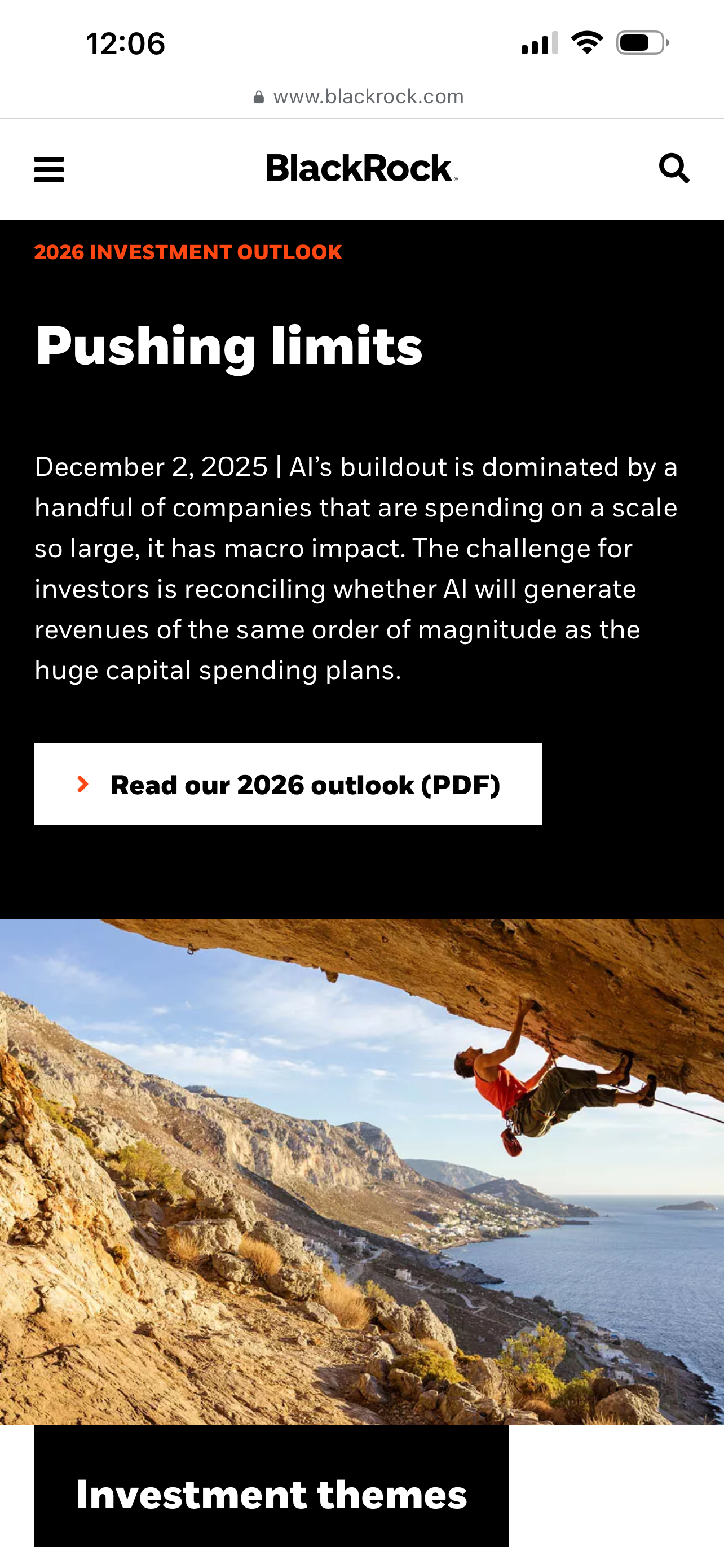 BLACKROCK Investment Institute με τίτλο «Pushing Limits – Ξεπερνώντας τα Όρια», η κεντρική εικόνα του δημοσιεύματος είναι μια φωτογραφία αναρριχητή στα βράχια της Καλύμνου.