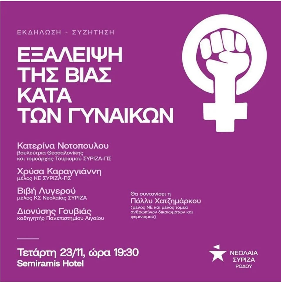 19:30 Εκδήλωση της Νεολαίας ΣΥΡΙΖΑ Ρόδου με θέμα «ΕΞΑΛΕΙΨΗ ΤΗΣ ΒΙΑΣ ΚΑΤΑ ΤΩΝ ΓΥΝΑΙΚΩΝ» στο Ξενοδοχείο Semiramis