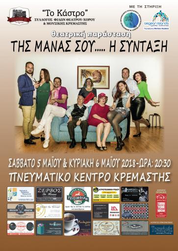 ΔΕΛΤΙΟ ΤΥΠΟΥ-Ο Δημοτικός Οργανισμός Πολιτισμού – Αθλητισμού Ρόδου σε συνεργασία με την Θεατρική Ομάδα του Συλλόγου Φίλων Θεάτρου – Χορού και Μουσικής «ΤΟ ΚΑΣΤΡΟ» θα παρουσιάσουν την κωμωδία «Της μάνας σου… η σύνταξη!!!» σε σενάριο Μαρίας Ν. Κίτρα και σκηνοθεσία Σουσάνας Καρδούλια. Οι παραστάσεις έχουν προγραμματιστεί για το Σάββατο 5 Μαΐου και την Κυριακή 6 Μαΐου 2018 , ώρα 20:30 στο Πνευματικό Κέντρο Κρεμαστής. Η σύγχρονη αυτή κωμωδία διαδραματίζεται στο σαλόνι μιας ελληνικής οικογένειας την εποχή της κρίσης !!! Μια απολαυστική ιστορία καθημερινών ανθρώπων που προσπαθούν να επιβιώσουν στην Ελλάδα της οικονομικής κρίσης χωρίς όμως να χάσουν ούτε στιγμή το ταμπεραμέντο τους, το χιούμορ τους και φυσικά την αγάπη τους για τη ζωή!!! Η θεατρική αυτή παράσταση αναδεικνύει σύγχρονα κοινωνικά θέματα και επιδιώκει άφθονο γέλιο. Παίζουν: Μιχάλης Λούπης, Παρασκευή Γιωργίου-Χατζηβασιλείου, Κωσταντίνος Τσαμπικάκης, Μαρία Προδρομίδου, Μιχαήλ Λαός, Σπυριδούλα Πάσσαρη, , Πάρης Μάτσης, Μαρίνα Κοκάρη, Άννα Τσουκαλά.