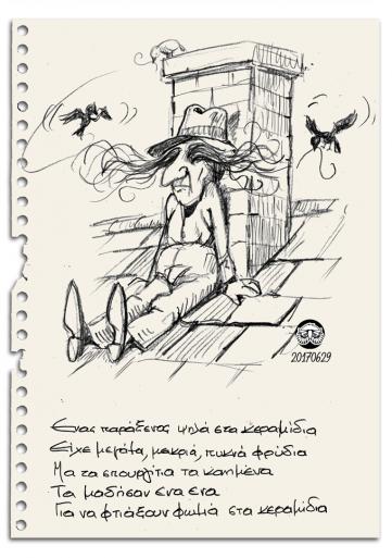 Το θερμόμετρο να παίζει ανάμεσα στος 39 και 41 C, ανάλογα με το που στεκόσουνα κι εμείς, η Νοομι κι εγώ έπρεπε να πάμε στην Λίνδο, για μια φίλη που είχα 30 σχεδόν χρόνια να την δω. Με την συνεργία του καύσωνα ήταν μια τραυματική εμπειρία. Πανέμορφη η Λίνδος μα κάποιος πρέπει να κάνει κάτι με το κυκλοφοριακό χάος που επικρατεί εκεί. Δεν ξέρω τι, δεν είναι δουλειά μου να βρώ λύσεις, ας συνέλθουνε συγκοινονιολόγοι, πολιτικολόγοι, τροχονόμοι, αρχιτέκτονες, γεφυροποιοί, μέντιουμ και δεν ξέρω τι άλλο κι ας βρουνε μια λύση. Η κατάσταση είναι απελπιστική και τελικά βλάπτει την ίδια την Λίνδο. Η αγανάχτηση μόνο κακά σχόλια προκαλεί. Κάθισα λοιπόν κάπου ν’ ανασάνω, να πάρω έναν φραπέ κι ένα ανψυκτικό (χωρίς απόδειξη). Κι επειδή “αργία μήτηρ πάσης κακίας” κι επειδή οι ιδέες κατεβαίνουν πολλές φορές με το έτσι θέλω, ιδού η ιδέα που μου κατέβηκε καθώς προσπαθούσα να αναψυχθώ. ΥΓ. Και κάτι άλλο μια κι είμαστε εδώ. Μαθαίνουμε πως η ΔΕΗ θα μας κόψει πάλι το ηλεκτρικό σήμερα Παρασκευή, ώρες 10.00 με 12.00. Σ’ ευχαριστούμε, ω εταιρεία (Σαββόπουλος) που διαλέγεις την κατάλληλη ημέρα και ώρα. Ετσι που να σταματήσουν ανεμιστήρες και κλιματιστικά, να λυώσουν οι πάγοι σε ψυγεία και καταψήκτες, να γίνουν γαλατάκι τα παγωτά. Την στιγμή που ο υδράργυρος χτυπάει κόκκινο, κι ας είναι μπάρ κι εστιατόρια γεμάτα με χιλιάδες γηγενείς και τουρίστες που γηρεύουν λίγη δροσιά κι ας διαθέτουν οι Δήμοι και το κράτος κλιματιζόμενους χώρους πρώτης ανάγκης, για όσους έχουν πρόβλημα. Σ’ ευχαριστώ, ω παντοδύναμη Εταιρεία. pavlidiscartoons.com/blog