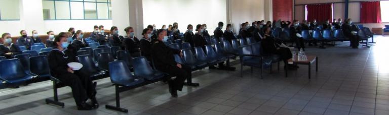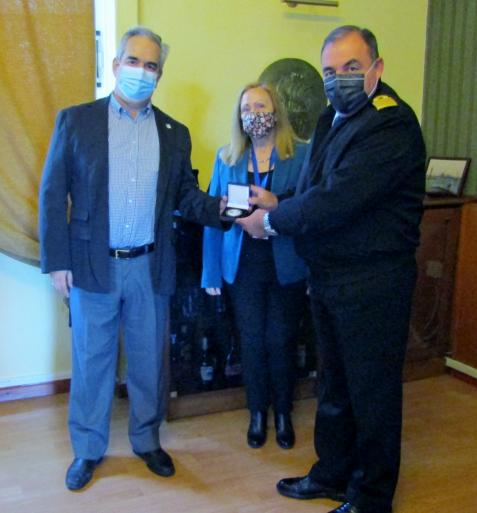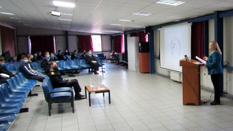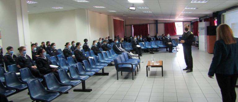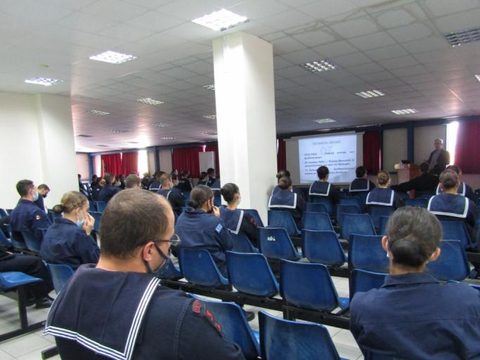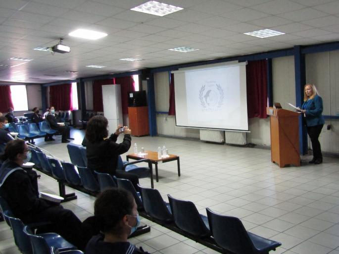 Κατά την άφιξή μας, είχαμε μια ζεστή υποδοχή από τον Διοικητή της Σχολής Πλοίαρχο κ. Χαρ. Γαβαλά (ΠΝ) και τον Διευθυντή Σπουδών Αντιπλοίαρχο κ. Κων. Ψαλίδα (ΠΝ) . Οι συνθήκες που υπαγορεύουν τα μέτρα προστασίας για τον covid , αν και άβολες, τηρήθηκαν με σχολαστικότητα και προχωρήσαμε στην προβολή της επιμορφωτικής παρουσιάσεώς μας, που ήταν αφιερωμένη στην μνήμη του Αντώνη Τσιμούρη, επιζώντα του Αντιτορπιλικού Βασίλισσα Όλγα, ο ποίος απεβίωσε προ ολίγων ημερών.