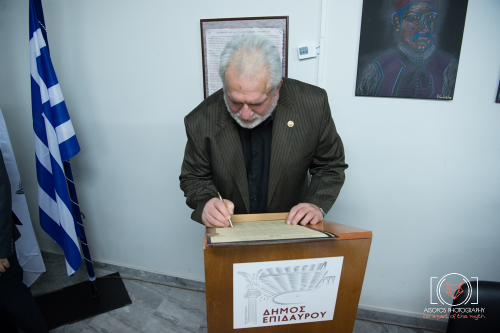 « Επιτρέψτε μου πριν απ' όλα να εκφράσω και δημόσια τις θερμές μου ευχαριστίες προς τον συνάδελφο Δήμαρχο Επιδαύρου, κ. Αναστάσιο Χρόνη, τόσο εμού προσωπικά όσο και του συνόλου των Κασιωτών συμπατριωτών μου για την τιμητική του πρόσκληση να παραβρεθώ, ως Εκπρόσωπος του Δήμου της Ηρωικής Νήσου Κάσου, στην παρούσα ιστορική επανασύνδεση των σημερινών αιρετών αυτοδιοικητικών εκπροσώπων των περιοχών εκείνων της πατρίδας μας, οι οποίες ίδρυσαν διά της πρωτοποριακής συμμετοχής των εντεταλμένων εκπροσώπων τους και με συναλληλία την πολιτική οντότητα του Νέου Ελληνικού Κράτους πριν διακόσια (200) ακριβώς χρόνια στο πλαίσιο της Α΄ Εθνοσυνέλευσης των Ελλήνων.