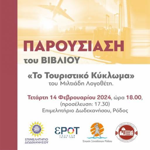Το βιβλίο του Μιλτιάδη Λογοθέτη «Το Τουριστικό Κύκλωμα», συν-παρουσιάζουν το Επιμελητήριο Δωδεκανήσου, η Επιστημονική Ομάδα Τουρισμού, η Ένωση Ξενοδόχων Ρόδου ο Σύλλογος Διευθυντών Ξενοδοχείων Ρόδου, την Τετάρτη 14 Φεβρουαρίου 2024 και ώρα 18.00 στην αίθουσα συνεδριάσεων Γ.Β.ΚΑΡΑΓΙΑΝΝΗΣ του Επιμελητηρίου Δωδεκανήσου. Για όσους βρίσκονται μακριά, ο δεσμός για την παρακολούθηση είναι: