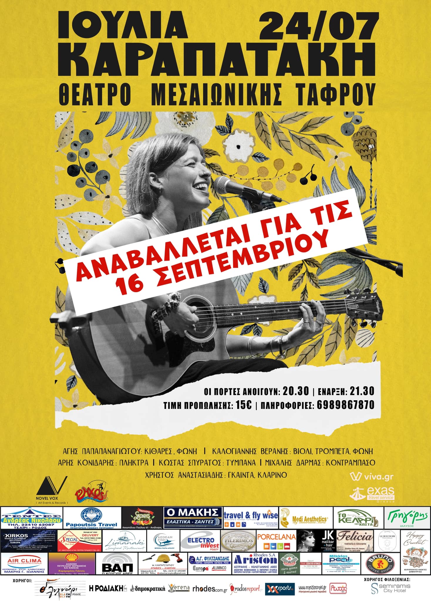Η συναυλία της Ιουλίας Καραπατάκη στη Ρόδο σε νέα ημερομηνία το Σάββατο 16 Σεπτεμβρίου στο Θέατρο Μεσαιωνικής Τάφρου