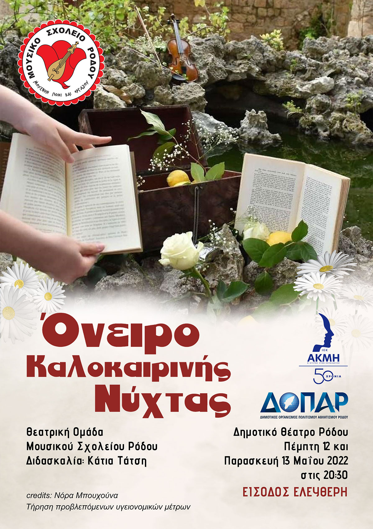 - Η Διεύθυνση και η θεατρική ομάδα του Μουσικού Σχολείου Ρόδου, σας προσκαλούμε στην παράσταση «Όνειρο Καλοκαιρινής Νύχτας» του Ουίλιαμ Σαίξπηρ, την Πέμπτη 12 και την Παρασκευή 13 Μαΐου 2022, στις 20:30, στο Δημοτικό Θέατρο Ρόδου.