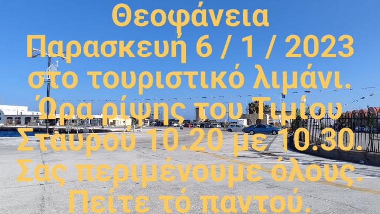 Θεοφάνεια στον άγιο Παντελεήμονα. Την Παρασκευή 6 Ιανουαρίου 2023 θα τελεστεί η θεία λειτουργία και ο μέγας αγιασμός εντός του ιερού ναού αγίου Παντελεήμονος και εν συνεχεία περί ώρα 10 με 10.10 θα ξεκινήσει ιερά πομπή όπου θα καταλήξει στο τουριστικό λιμάνι και θα γίνει η τελετή καθαγιασμού τών υδάτων από τον εφημέριο μας π. Χρήστο. Ώρα ρίψης του τιμίου Σταύρου 10.20 με 10.30. Όποιος θέλει να πέσει στη θάλασσα για να πιάσει τον τίμιο Σταυρό να είναι το αργότερο 9.30 στο χώρο του τουριστικού λιμανιού εκεί στην εξέδρα πού θα είναι στημένη. Υπάρχει και σχετική ανάρτηση μας στο προφίλ του αγίου. Κάντε το σάς παρακαλώ ανάρτηση στην εφημερίδα σάς. Καλή χρονιά.