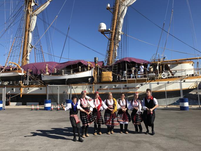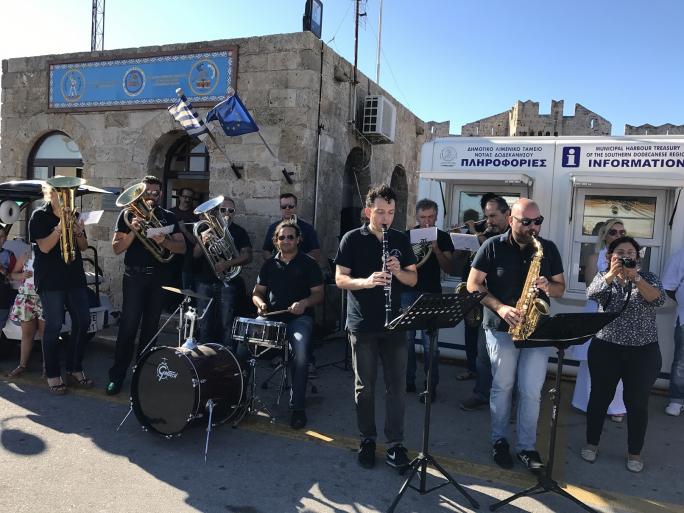 Εντυπωσιακές οι παρουσίες, της Φιλαρμονικής του Δήμου Ρόδου που, υπό τη διεύθυνση του μαέστρου Δημήτρη Χαλκιά, καλωσόριζε μουσικά το πλήρωμα του εκπαιδευτικού ιστιοφόρου, καθώς και του Πολιτιστικού Λαογραφικού Συλλόγου Κρεμαστής «Η Πρόοδος», τα μέλη του οποίου ντυμένα με παραδοσιακές φορεσιές και με την καθοδήγηση του προέδρου τους κ. Νίκου Μπάτη, χόρεψαν τοπικούς χορούς.