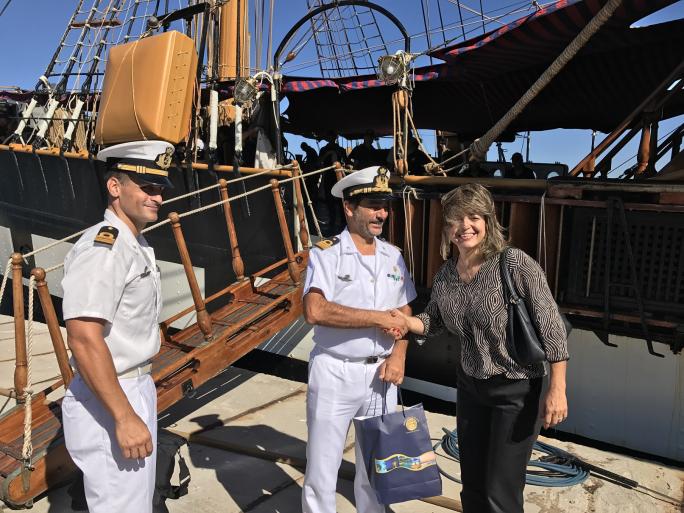 Η αντιδήμαρχος Τουρισμού, Διεθνούς Προβολής και Αποδήμων Ροδίων κα Μαρίζα Χατζηλαζάρου, παρουσία και του προξένου της Ιταλίας στη Ρόδου κ. Νίκου Φαρμακίδη, καλωσόρισε στη Ρόδο, όλο το πλήρωμα του ιστιοφόρου, τον καπετάνιο Giuseppe Valentini, τους αξιωματικούς και τους 33 δόκιμους της Ιταλικής Σχολής του Τάραντο (Taranto) και τους ευχήθηκε καλή παραμονή στο νησί, ενώ στη συνέχεια ξεναγήθηκε στο πλοίο.