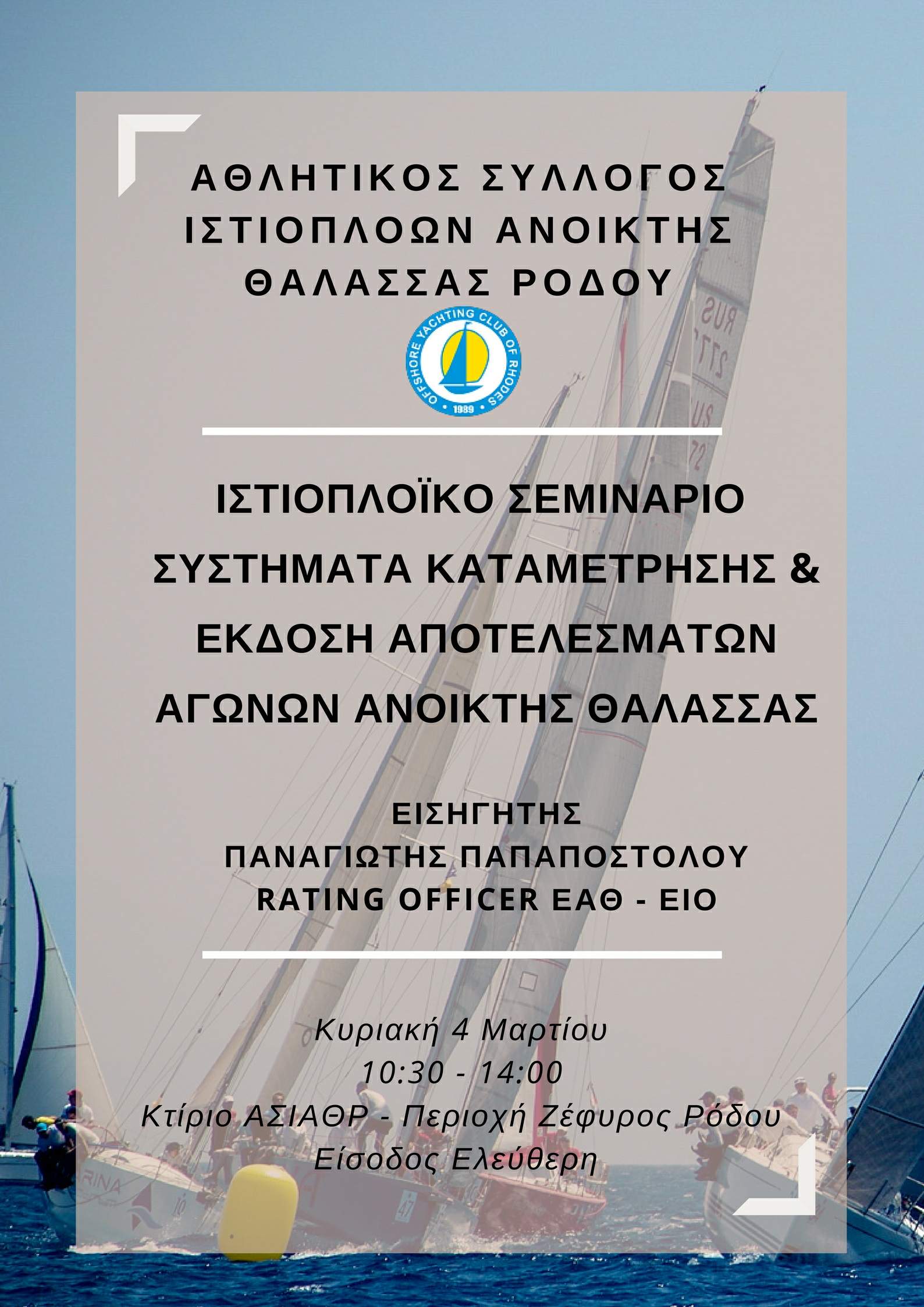 Στα πλαίσια της διαρκούς επιμόρφωσης των μελών του και όσων ενδιαφέρονται για την αγωνιστική ιστιοπλοΐα, ο ΑΣΙΑΘ Ρόδου διοργανώνει ιστιοπλοϊκό σεμινάριο με θέμα «Συστήματα καταμέτρησης και έκδοση αποτελεσμάτων αγώνων ανοικτής θάλασσας». Εισηγητής θα είναι ο Παναγιώτης Παπαποστόλου, Rating Officer της Επιτροπής Ανοικτής Θάλασσας της Ελληνικής Ιστιοπλοϊκής Ομοσπονδίας. Το Σεμινάριο θα πραγματοποιηθεί την Κυριακή 4 Μαρτίου στο κτίριο του ΑΣΙΑΘΡ στον Ζέφυρο με ώρα προσέλευσης 10:30 π.μ. Η είσοδος είναι δωρεάν.