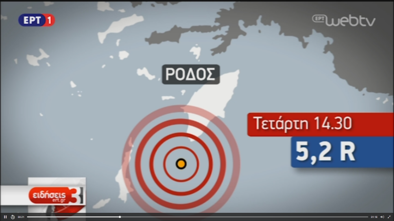Πριν απο λίγα λεπτά, γύρω στις 2,30 το μεσημέρι, ισχυρός σεισμός ταρακούνησε τη Ρόδο! Ήταν και ισχυρός και διάρκειας...Ηταν 5,2 Ρίχτερ, με βάθος 10 χιλιόμετρα και επίκεντρο στη θαλάσσια περιοχή δυτικά της Καταβιάς. Εγινε αισθητός στη πόλη, στη Νότια Ρόδο και στα νησιά Χάλκη, Κάρπαθο και Κάσο. Μέχρι στιγμής δεν ε΄χουν καταγραφεί ζημιές. Ο σεισμός εγινε ιδιαίτερα αισθητός σε ψηλά κτίρια και είχε και αρκετή διάρκεια.