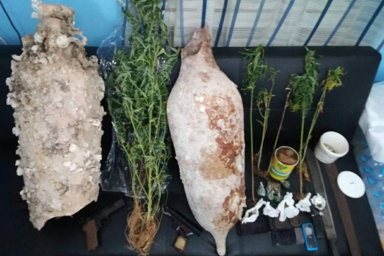 Κατασχέθηκαν -8- δενδρύλλια και -30- γρ. κάνναβης, -208- γρ αδασμολόγητου καπνού, -2- σπαθιά, στιλέτο, -2- αρχαίοι αμφορείς κ.α.