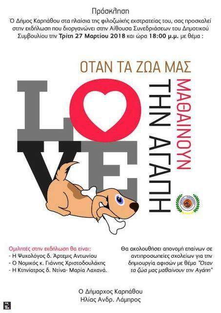 ΔΕΛΤΙΟ ΤΥΠΟΥ-Θέμα: "ΟΤΑΝ ΤΑ ΖΩΑ ΜΑΣ ΜΑΘΑΙΝΟΥΝ ΤΗΝ ΑΓΑΠΗ" -Εκδήλωση με θέμα " Όταν τα ζώα μας μαθαίνουν την Αγάπη" διοργανώνει ο Δήμος Καρπάθου στο πλαίσιο της φιλοζωϊκής του εκστρατείας. Η εκδήλωση θα πραγματοποιηθεί την Τρίτη 27 Μαρτίου 2018 στις 18: 00 στην Αίθουσα Συνεδριάσεων του Δημοτικού Συμβουλίου . Ομιλητές στην Εκδήλωση : Η ψυχολόγος δ. Άρτεμις Αντωνίου Ο Νομικός κ. Γιάννης Χριστοδουλάκης Η Κτηνίατρος δ. Ντίνα- Μαρία Λαχανά