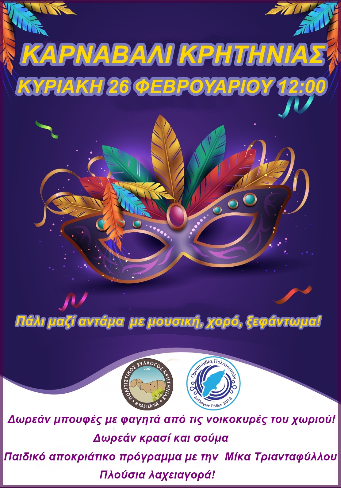 Καρναβάλι στην Κρητηνία την Κυριακή 26 Φεβρουαρίου στις 12 το μεσημέρι. Πλούσιος μπουφές απο φαγητά μαγειρεμένα απο τις γυναίκες του χωριού,κρασί,σούμα και πλούσιο παιδικό πρόγραμμα.
