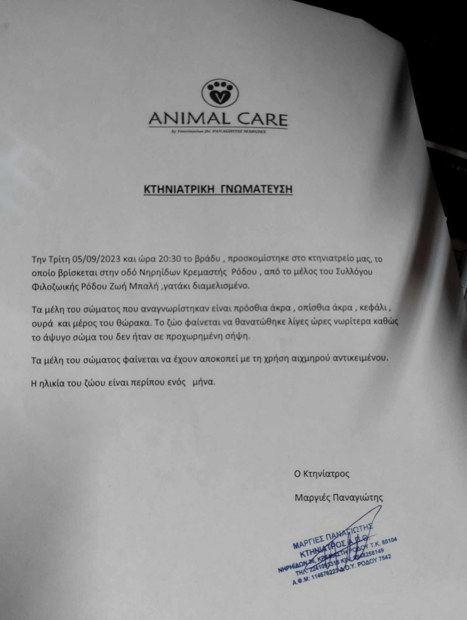 Αναρτήθηκε η γνωμάτευση του κτηνιάτρου Μαργιέ Παναγιώτη για το κατακρεουργημένο γατάκι που βρέθηκε κάπου στην Ρόδο. Το γατάκι ήταν περίπου ενός μηνός και εχει κατακρεουργηθεί απο αιχμηρό αντικείμενο γράφει η γνωμάτευση.