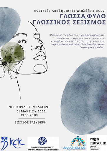Η Περιφέρεια Νοτίου Αιγαίου, το Κ.Ε.Κ. Γ. Γεννηματάς και το Μουσείο Νεοελληνικής Τέχνης Δήμου Ρόδου διοργανώνουν την τρίτη κατά σειρά ημερίδα στο πλαίσιο της διοργάνωσης των "Ανοικτών Ακαδημαϊκών Διαλέξεων 2022" με τίτλο"Γλώσσα,φύλο,γλωσσικός σεξισμός" σε συνεργασία με το τμήμα Μεσογειακών Σπουδών της Σχολής Ανθρωπιστικών Επιστημών, του Πανεπιστημίου Αιγαίου και την Πρόεδρο καθηγήτρια κ. Κατερίνα Θ.Φραντζή.