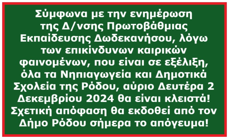 ΚΛΕΙΣΤΑ ΤΑ ΔΗΜΟΤΙΚΑ ΚΑΙ ΝΗΠΙΑΓΩΓΕΊΑ ΤΗΣ ΡΟΔΟΥ ΓΙΑ ΑΥΡΙΟ ΔΕΥΤΕΡΑ 2 ΔΕΚΕΜΒΡΙΟΥ 2024