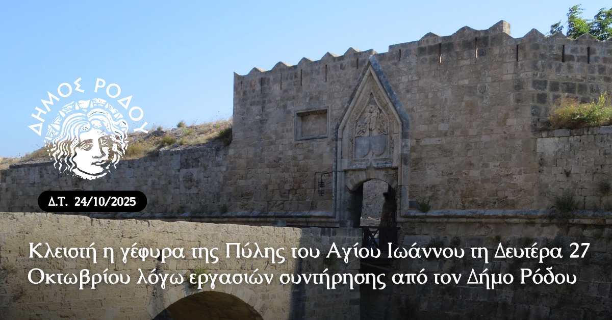 Οι εργασίες θα πραγματοποιηθούν τη Δευτέρα 27 Οκτωβρίου 2025, από τις 08:00 έως τις 12:00, από τη Διεύθυνση Μεσαιωνικής Πόλης και Μνημείων του Δήμου Ρόδου.