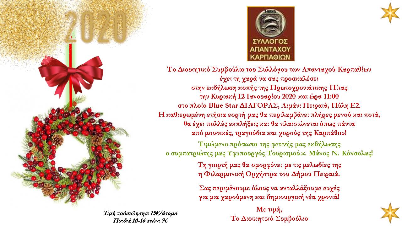 -Σας περιμένουμε όλους να γιορτάσουμε τον ερχομό του νέου έτους και να ανταλλάξουμε ευχές στην εκδήλωση κοπής της Βασιλόπιτας του Συλλόγου μας την Κυριακή 12 Ιανουαρίου 2020 και ώρα 11.00 στο πλοίο Blue Star Διαγόρας, στο λιμάνι του Πειραιά, πύλη Ε2.