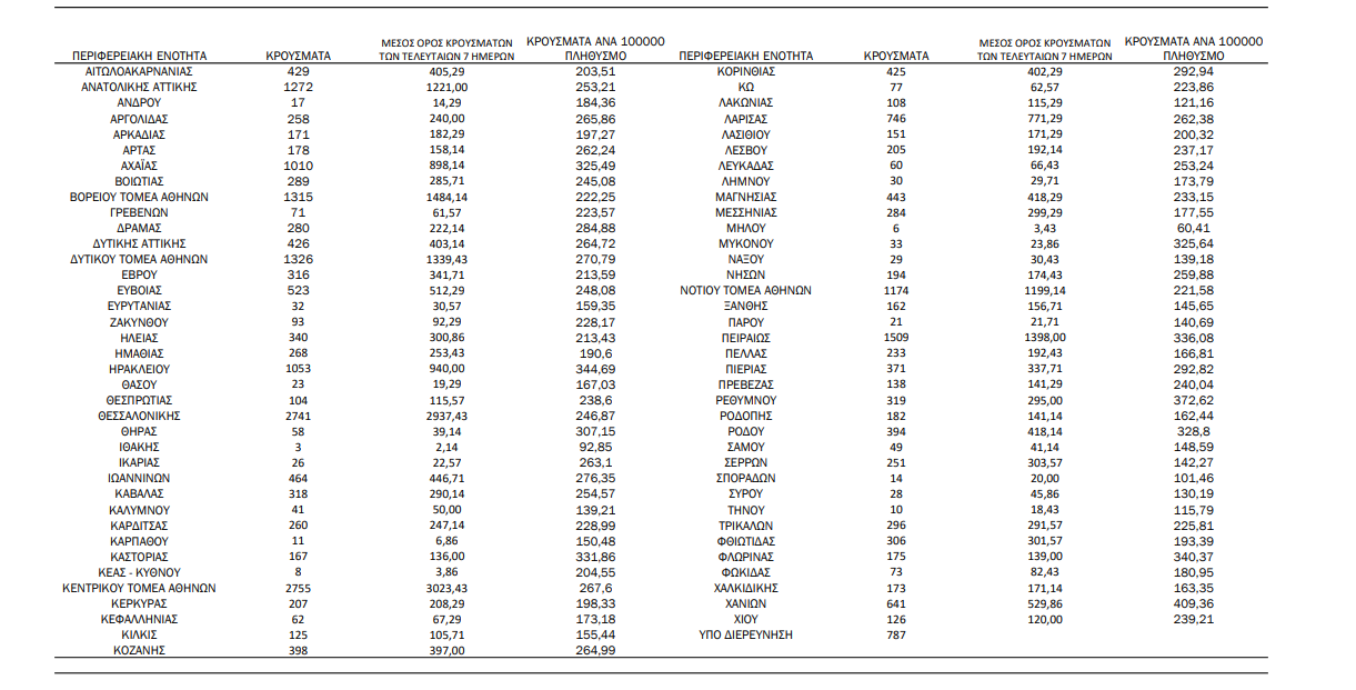 H σημερινή ανακοίνωση του ΕΟΔΥ: Τα νέα εργαστηριακά επιβεβαιωμένα κρούσματα της νόσου που καταγράφηκαν τις τελευταίες 24 ώρες είναι 27.766, εκ των οποίων 85 εντοπίστηκαν κατόπιν ελέγχων στις πύλες εισόδου της χώρας. Ο συνολικός αριθμός των κρουσμάτων ανέρχεται σε 1.535.382, εκ των οποίων το 49,9% είναι άνδρες. Με βάση τα επιβεβαιωμένα κρούσματα των τελευταίων 7 ημερών, 610 θεωρούνται σχετιζόμενα με ταξίδι από το εξωτερικό και 1.727 είναι σχετιζόμενα με ήδη γνωστό κρούσμα.