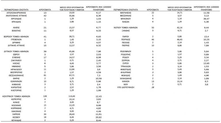 Με βάση τα επιβεβαιωμένα κρούσματα των τελευταίων 7 ημερών, 31 θεωρούνται σχετιζόμενα με ταξίδι από το εξωτερικό και 1.523 είναι σχετιζόμενα με ήδη γνωστό κρούσμα.