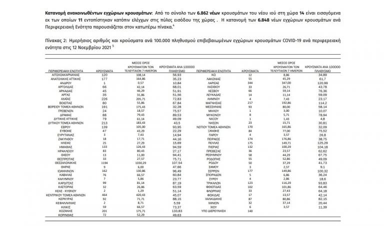 H σημερινή ανακοίνωση του ΕΟΔΥ: «τα νέα εργαστηριακά επιβεβαιωμένα κρούσματα της νόσου που καταγράφηκαν τις τελευταίες 24 ώρες είναι 6.862, εκ των οποίων 11 εντοπίστηκαν κατόπιν ελέγχων στις πύλες εισόδου της χώρας. Ο συνολικός αριθμός των κρουσμάτων ανέρχεται σε 821.900 (ημερήσια μεταβολή +0.8%), εκ των οποίων 50.7% άνδρες. Με βάση τα επιβεβαιωμένα κρούσματα των τελευταίων 7 ημερών, 129 θεωρούνται σχετιζόμενα με ταξίδι από το εξωτερικό και 3.072 είναι σχετιζόμενα με ήδη γνωστό κρούσμα.