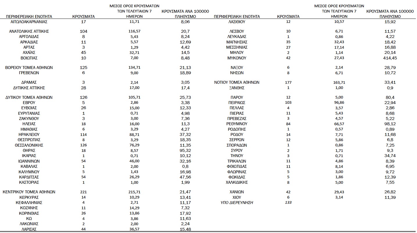 Με βάση τα επιβεβαιωμένα κρούσματα των τελευταίων 7 ημερών, 156 θεωρούνται σχετιζόμενα με ταξίδι από το εξωτερικό και 1.874 είναι σχετιζόμενα με ήδη γνωστό κρούσμα.
