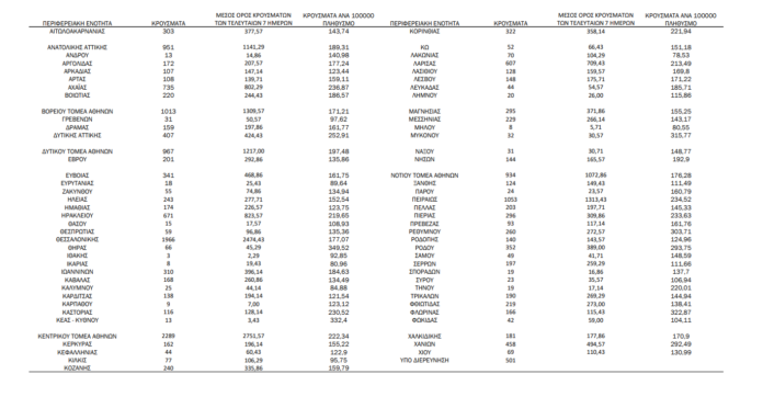 Η κατανομή των 20.339 νέων εγχώριων κρουσμάτων ανά Περιφερειακή Ενότητα παρουσιάζεται στον κατωτέρω πίνακα