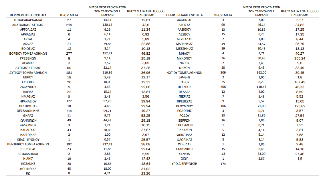 Με βάση τα επιβεβαιωμένα κρούσματα των τελευταίων 7 ημερών, 164 θεωρούνται σχετιζόμενα με ταξίδι από το εξωτερικό και 1.953 είναι σχετιζόμενα με ήδη γνωστό κρούσμα.