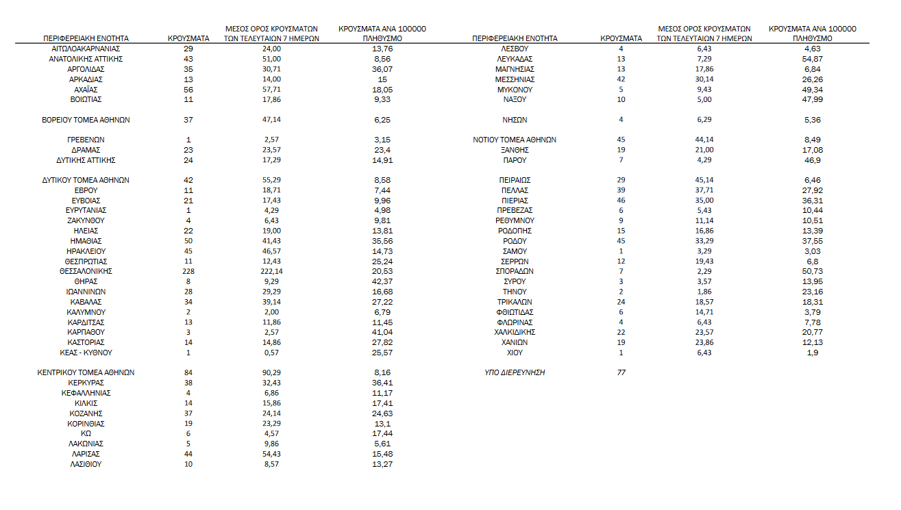 Με βάση τα επιβεβαιωμένα κρούσματα των τελευταίων 7 ημερών, 151 θεωρούνται σχετιζόμενα με ταξίδι από το εξωτερικό και 2.595 είναι σχετιζόμενα με ήδη γνωστό κρούσμα.