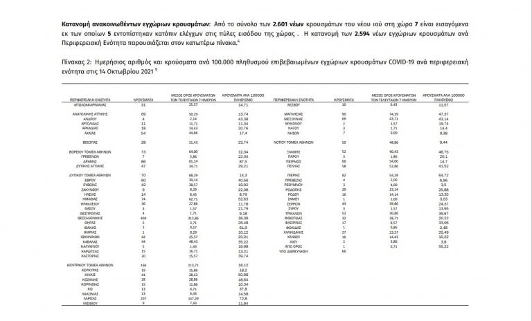 «Τα νέα εργαστηριακά επιβεβαιωμένα κρούσματα της νόσου που καταγράφηκαν τις τελευταίες 24 ώρες είναι 2.601, εκ των οποίων 5 εντοπίστηκαν κατόπιν ελέγχων στις πύλες εισόδου της χώρας. Ο συνολικός αριθμός των κρουσμάτων ανέρχεται σε 687.278 (ημερήσια μεταβολή +0.4%), εκ των οποίων 50.9% άνδρες. Με βάση τα επιβεβαιωμένα κρούσματα των τελευταίων 7 ημερών, 111 θεωρούνται σχετιζόμενα με ταξίδι από το εξωτερικό και 2.617 είναι σχετιζόμενα με ήδη γνωστό κρούσμα.
