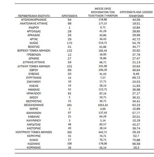 Ο μέσος όρος εισαγωγών του επταημέρου είναι 382 ασθενείς.Η διάμεση ηλικία των κρουσμάτων είναι 38 έτη (εύρος 0.2 έως 106 έτη), ενώ η διάμεση ηλικία των θανόντων είναι 78 έτη (εύρος 0.2 έως 106 έτη)».