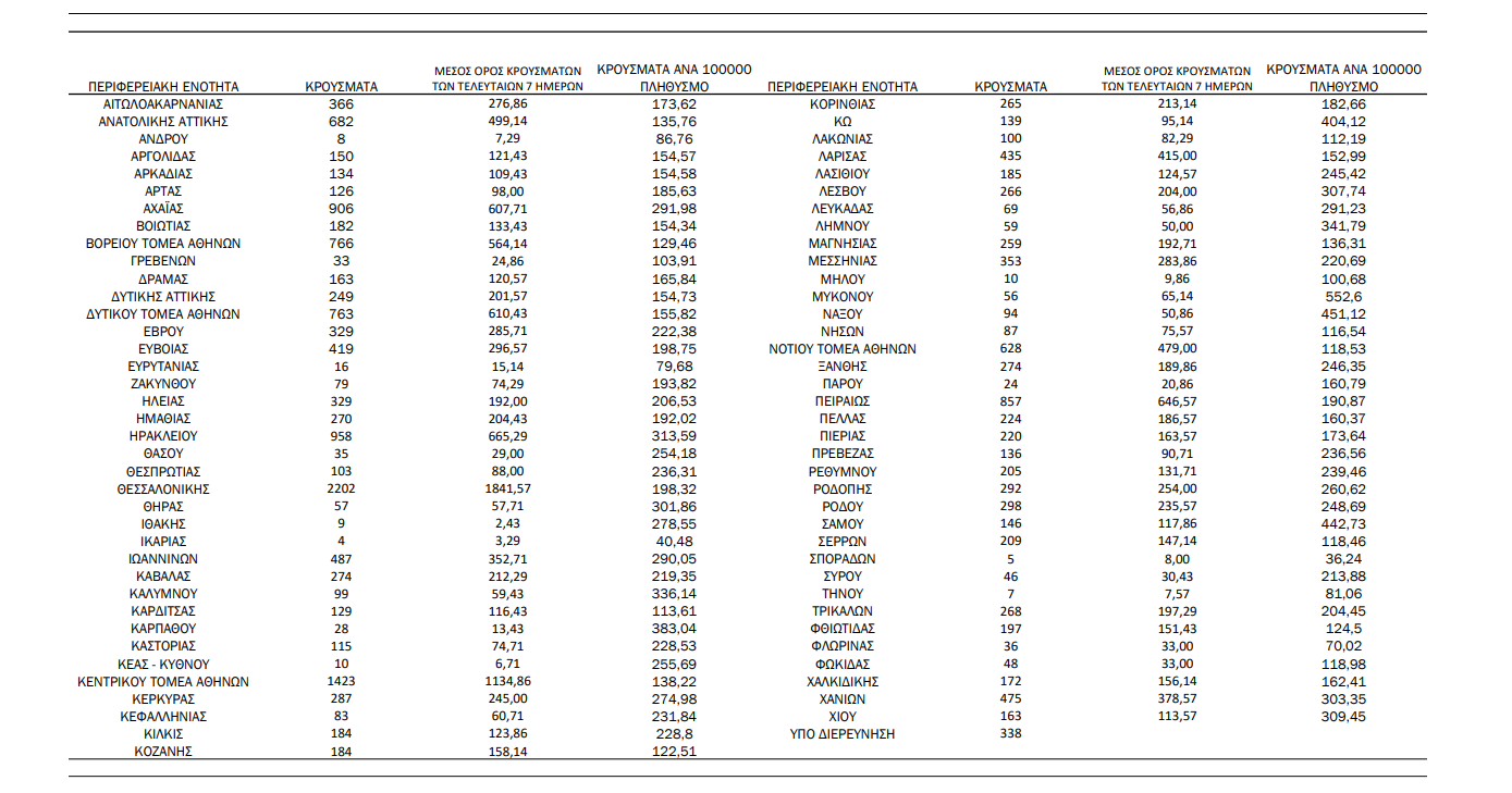Η σημερινή ανακοίνωση του ΕΟΔΥ: «Τα νέα εργαστηριακά επιβεβαιωμένα κρούσματα της νόσου που καταγράφηκαν τις τελευταίες 24 ώρες είναι 20.361, εκ των οποίων 69 εντοπίστηκαν κατόπιν ελέγχων στις πύλες εισόδου της χώρας.