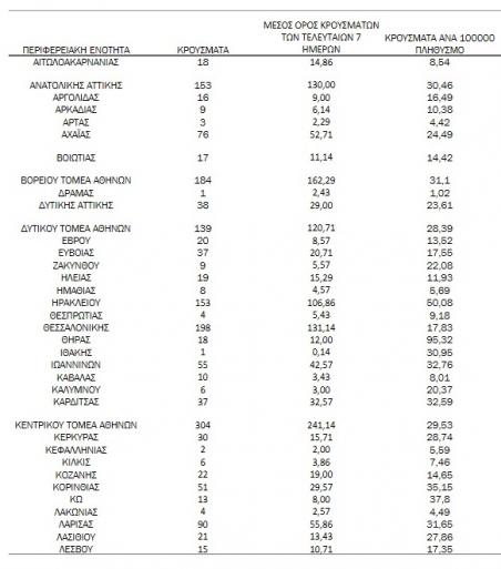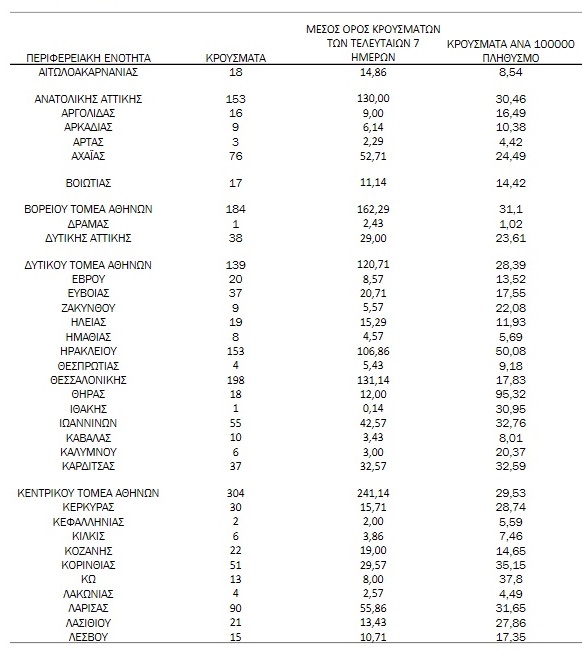 Με βάση τα επιβεβαιωμένα κρούσματα των τελευταίων 7 ημερών, 159 θεωρούνται σχετιζόμενα με ταξίδι από το εξωτερικό και 1.633 είναι σχετιζόμενα με ήδη γνωστό κρούσμα.