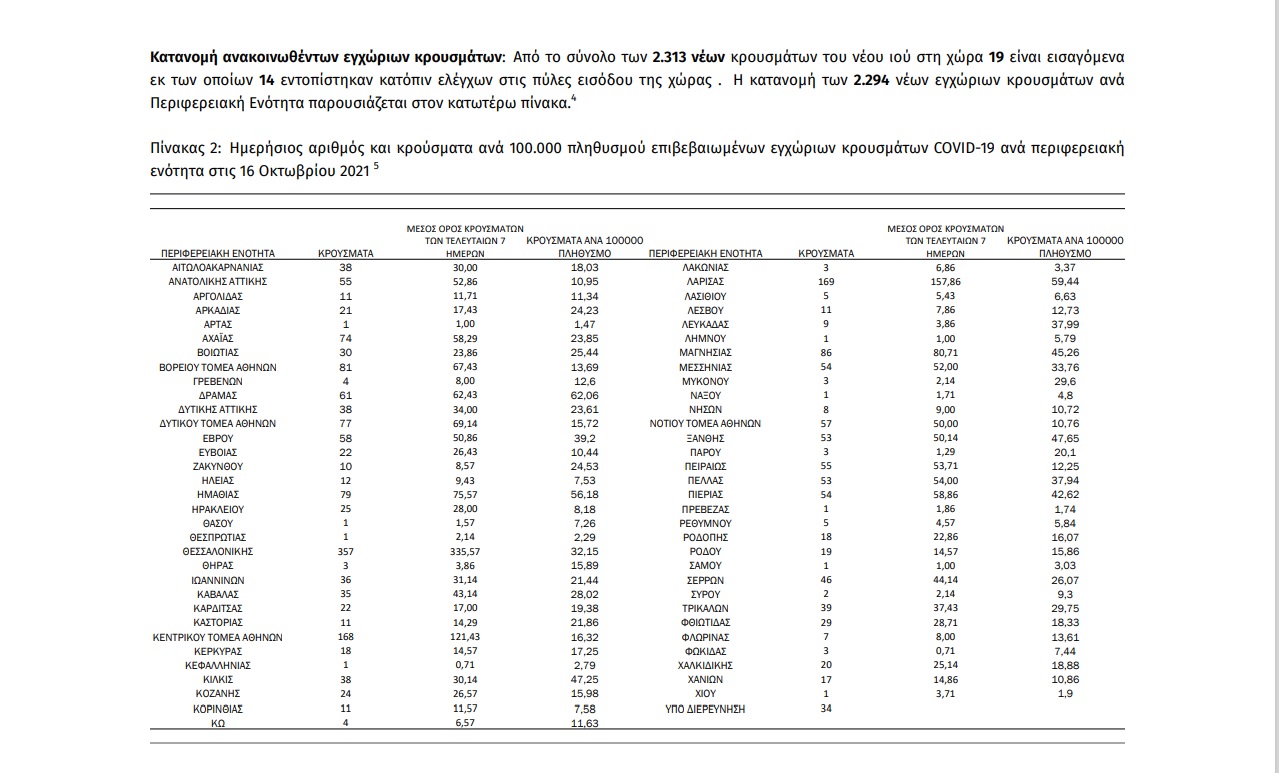 Η σημερινή ανακοίνωση του ΕΟΔΥ: «τα νέα εργαστηριακά επιβεβαιωμένα κρούσματα της νόσου που καταγράφηκαν τις τελευταίες 24 ώρες είναι 2.313, εκ των οποίων 14 εντοπίστηκαν κατόπιν ελέγχων στις πύλες εισόδου της χώρας. Ο συνολικός αριθμός των κρουσμάτων ανέρχεται σε 692.197 (ημερήσια μεταβολή +0.3%), εκ των οποίων 50.8% άνδρες. Με βάση τα επιβεβαιωμένα κρούσματα των τελευταίων 7 ημερών, 116 θεωρούνται σχετιζόμενα με ταξίδι από το εξωτερικό και 2.171 είναι σχετιζόμενα με ήδη γνωστό κρούσμα.