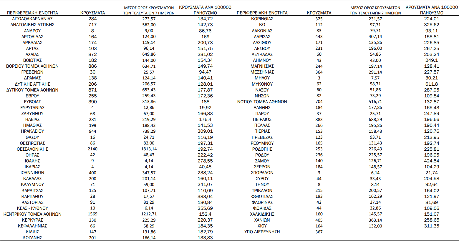 Ο συνολικός αριθμός των κρουσμάτων ανέρχεται σε 2.235.920 (ημερήσια μεταβολή +0.9%), εκ των οποίων 49.7% άνδρες. Με βάση τα επιβεβαιωμένα κρούσματα των τελευταίων 7 ημερών, 373 θεωρούνται σχετιζόμενα με ταξίδι από το εξωτερικό και 2.186 είναι σχετιζόμενα με ήδη γνωστό κρούσμα.