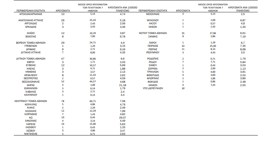 Με βάση τα επιβεβαιωμένα κρούσματα των τελευταίων 7 ημερών, 24 θεωρούνται σχετιζόμενα με ταξίδι από το εξωτερικό και 1.089 είναι σχετιζόμενα με ήδη γνωστό κρούσμα.