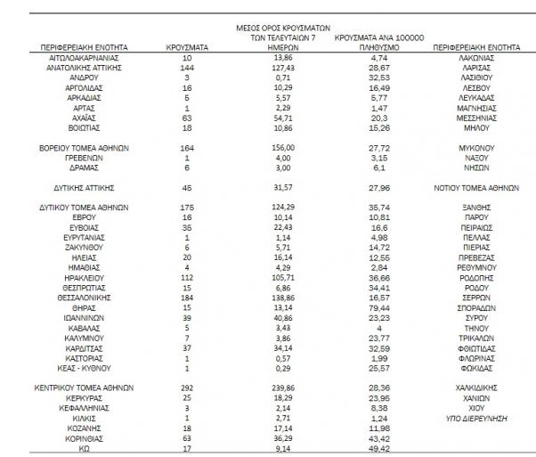 Με βάση τα επιβεβαιωμένα κρούσματα των τελευταίων 7 ημερών, 167 θεωρούνται σχετιζόμενα με ταξίδι από το εξωτερικό και 1.721 είναι σχετιζόμενα με ήδη γνωστό κρούσμα.