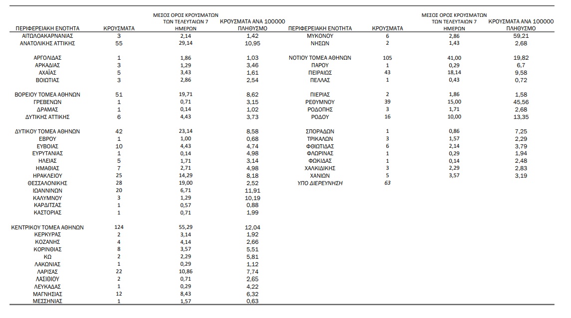 Με βάση τα επιβεβαιωμένα κρούσματα των τελευταίων 7 ημερών, 93 θεωρούνται σχετιζόμενα με ταξίδι από το εξωτερικό και 677 είναι σχετιζόμενα με ήδη γνωστό κρούσμα.