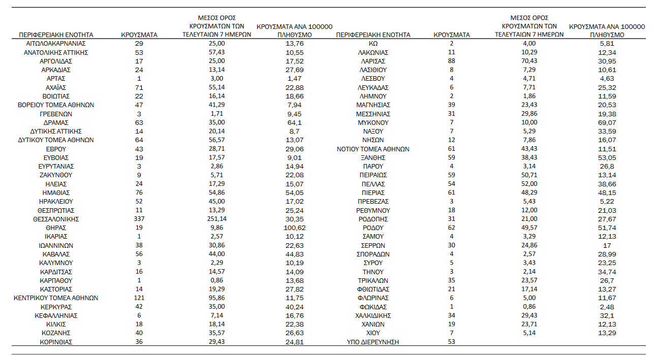 Με βάση τα επιβεβαιωμένα κρούσματα των τελευταίων 7 ημερών, 128 θεωρούνται σχετιζόμενα με ταξίδι από το εξωτερικό και 2.984 είναι σχετιζόμενα με ήδη γνωστό κρούσμα.