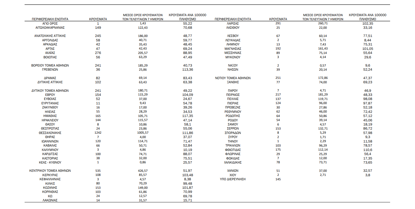 Με βάση τα επιβεβαιωμένα κρούσματα των τελευταίων 7 ημερών, 103 θεωρούνται σχετιζόμενα με ταξίδι από το εξωτερικό και 2.879 είναι σχετιζόμενα με ήδη γνωστό κρούσμα.