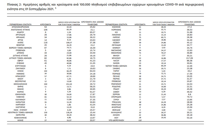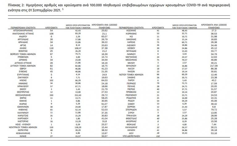 Ο αριθμός των ασθενών που νοσηλεύονται διασωληνωμένοι είναι 346 (58.4% άνδρες). Η διάμεση ηλικία τους είναι 65 έτη. To 84.7% έχει υποκείμενο νόσημα ή/και ηλικία 70 ετών και άνω. Μεταξύ των ασθενών που νοσηλεύονται διασωληνωμένοι, 319 (92.2%) είναι ανεμβολίαστοι ή μερικώς εμβολιασμένοι και 27 (7.8%) είναι πλήρως εμβολιασμένοι. Από την αρχή της πανδημίας έχουν εξέλθει από τις ΜΕΘ 2,980 ασθενείς. Οι εισαγωγές νέων ασθενών Covid-19 στα νοσοκομεία της επικράτειας είναι 267 (ημερήσια μεταβολή +11.72%). Ο μέσος όρος εισαγωγών του επταημέρου είναι 256 ασθενείς. Η διάμεση ηλικία των κρουσμάτων είναι 39 έτη (εύρος 0.2 έως 106 έτη), ενώ η διάμεση ηλικία των θανόντων είναι 78 έτη (εύρος 0.2 έως 106 έτη).