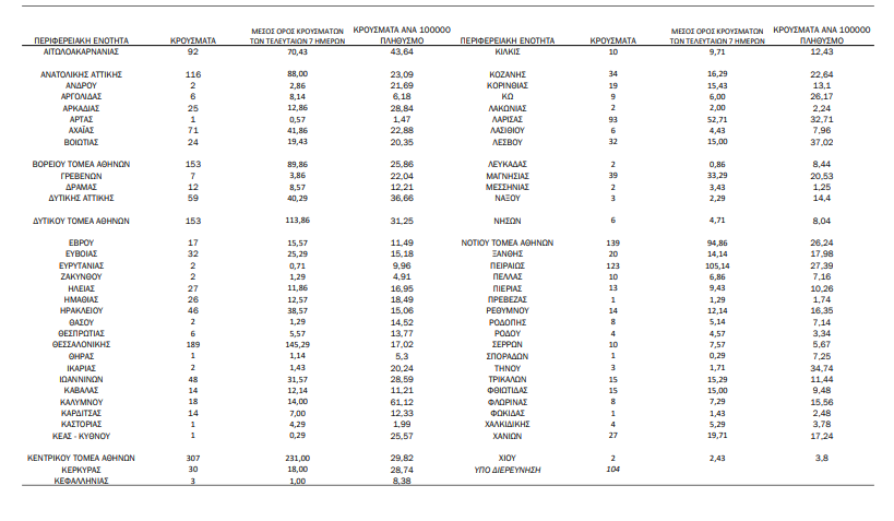 Η σημερινή ανακοίνωση του ΕΟΔΥ: “Τα νέα εργαστηριακά επιβεβαιωμένα κρούσματα της νόσου που καταγράφηκαν τις τελευταίες 24 ώρες είναι 2.293, εκ των οποίων 5 εντοπίστηκαν κατόπιν ελέγχων στις πύλες εισόδου της χώρας. Ο συνολικός αριθμός των κρουσμάτων ανέρχεται σε 383.558 (ημερήσια μεταβολή +0.6%), εκ των οποίων 51.2% άνδρες.
