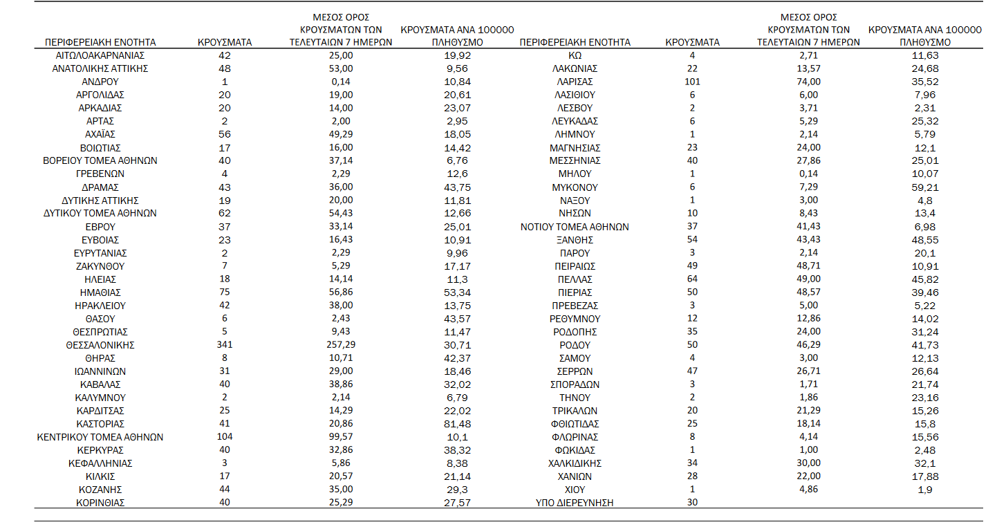 Με βάση τα επιβεβαιωμένα κρούσματα των τελευταίων 7 ημερών, 138 θεωρούνται σχετιζόμενα με ταξίδι από το εξωτερικό και 2.866 είναι σχετιζόμενα με ήδη γνωστό κρούσμα.