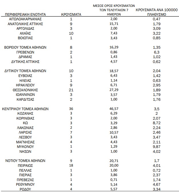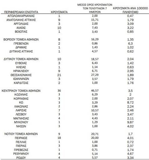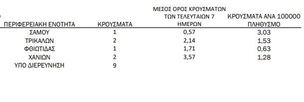 Με βάση τα επιβεβαιωμένα κρούσματα των τελευταίων 7 ημερών, 32 θεωρούνται σχετιζόμενα με ταξίδι από το εξωτερικό και 672 είναι σχετιζόμενα με ήδη γνωστό κρούσμα.