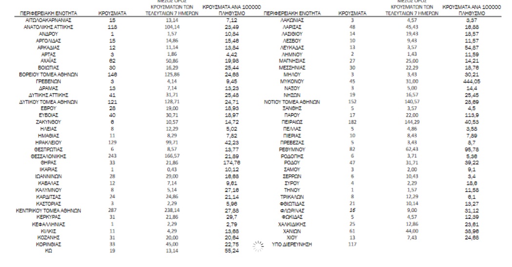 Με βάση τα επιβεβαιωμένα κρούσματα των τελευταίων 7 ημερών, 131 θεωρούνται σχετιζόμενα με ταξίδι από το εξωτερικό και 1.325 είναι σχετιζόμενα με ήδη γνωστό κρούσμα.